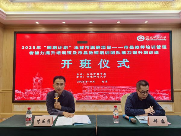 2025年10月20日上午,由玉林市教育局主办、福建师范大学承办的2025年“国培计划”玉林市统筹项目——市县教师培训管理者能力提升培训班及市县教师培训团队能力提升培训班,在江苏省南京市同步开班。本次培训双班同启,旨在同步强化玉林市教师培训“管理端”与“执行端”的核心能力,为区域教师队伍建设提质增效筑牢关键支撑。玉林市教育局教师培训中心主任李国符、福建师范大学培训学院副院长郑磊出席开班式。